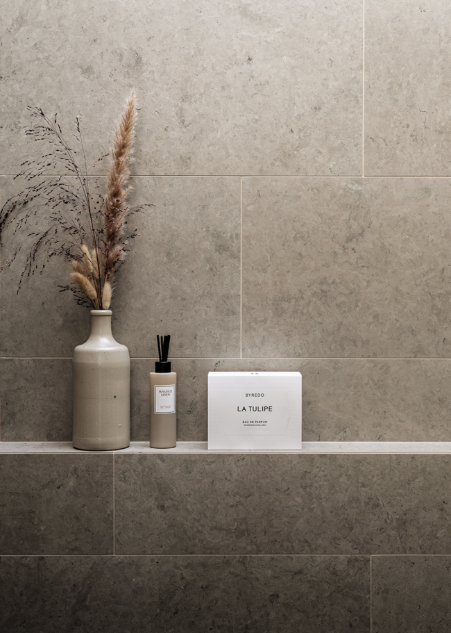 This beautiful home on Värmdö in Stockholm’s archipelago has Runö Warm Grey throughout the bathroom, WC and sauna. With its matt, non-slip surface, J Runö Warm Grey is well suited to all spaces, without feeling rough. The tiles have a very natural limestone look with varying tone differences in individual tiles, beautifully bringing the space to life.