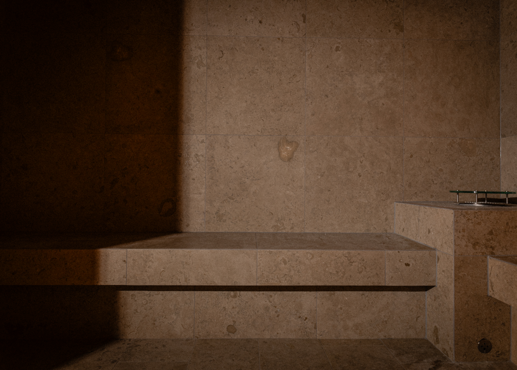 I dette spa-anlæg har kunden brugt Norrvange Beige i en specialbestilt R11 overflade. I bassinet er Norrvange Beige brugt som 05x05 mosaik.
