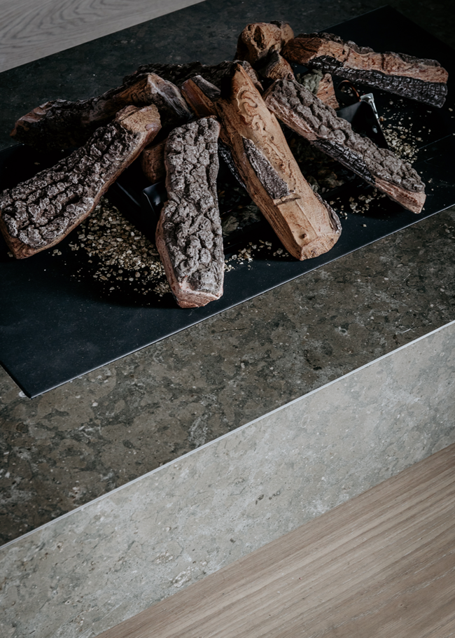 I denne villa har kunden gennemgående anvendt Azul Olive. Serien J Azul Olive er en granitkeramik inspireret af den meget populære portugisiske kalksten Azul Valverde. Stenen er en kendt klassiker, der bruges over hele Europa på gulve og vægge og som bordplader.